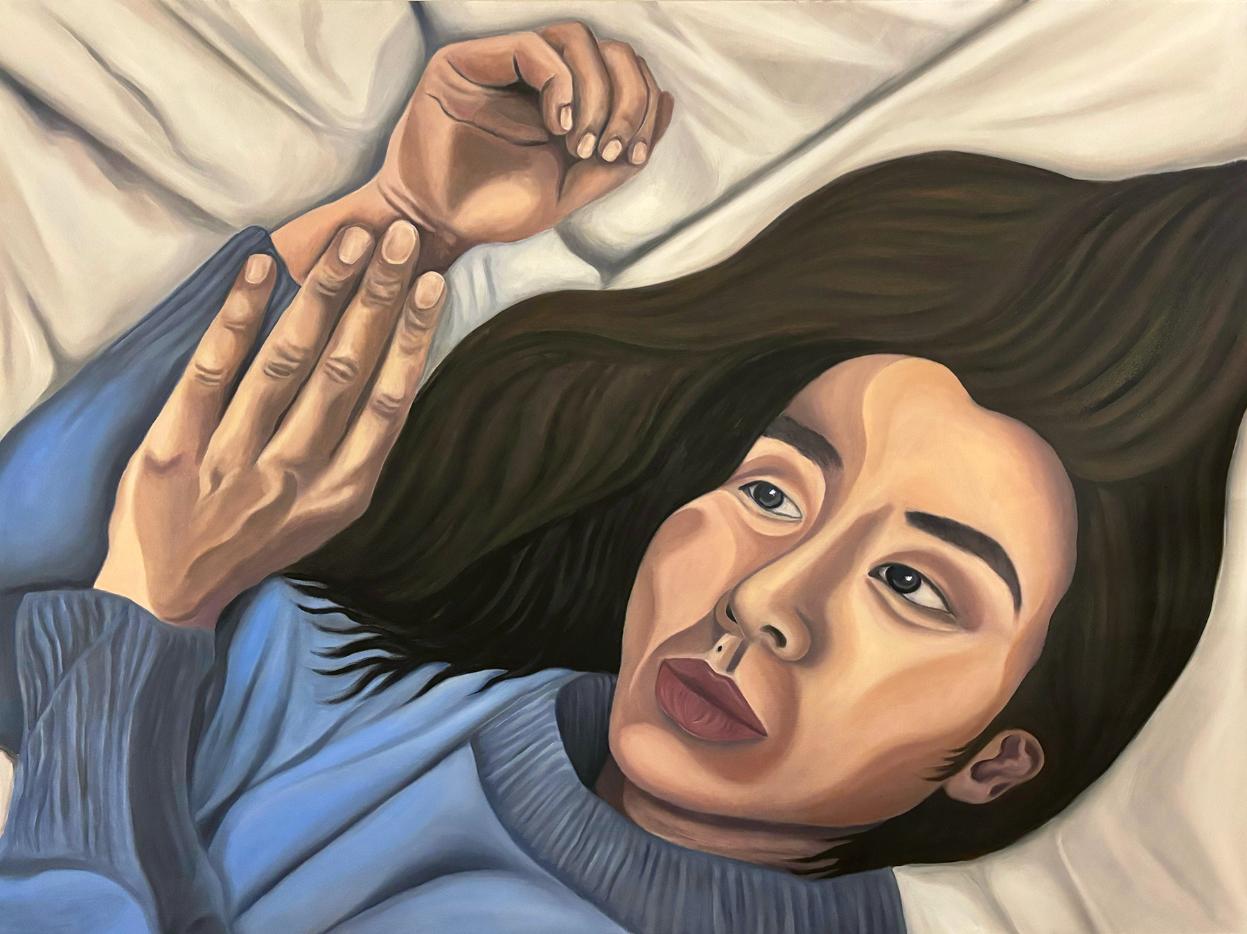 For the largest painting of the exhibition, I wanted to convey the overwhelming emotions of self-isolation and social withdrawal that have become increasingly common in today's digital world. The painting is inspired by the term "bedrot," a “self-care” trend that was made popular on TikTok that involves staying in bed for extended periods of time to recharge. I have engaged in my fair share of bedrotting, only to find myself scrolling through social media for hours in a desperate search for dopamine driven connection, only to retreat further into solitude. I wanted to bring to life the feeling of being paralyzed in a cocoon of disconnection and stagnation, a state I’ve become all too familiar with in today’s social media-obsessed world. We find ourselves trapped in a vicious cycle—burnt out by the relentless pace of modern life, then turning to social media in an attempt to cope, only to find it deepens our exhaustion and isolation.